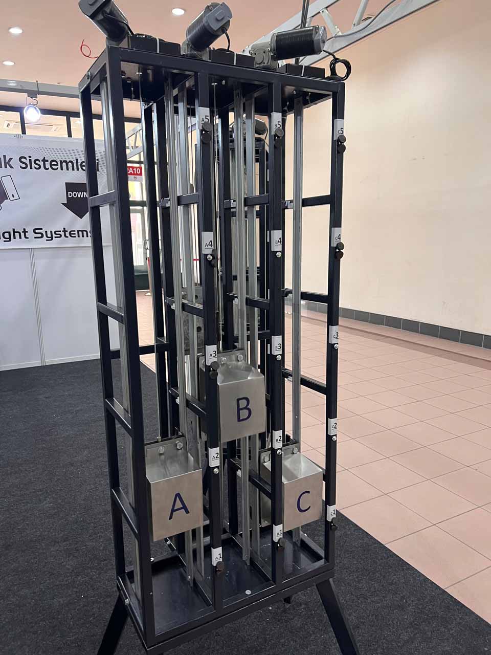 One of the most striking innovative designs of the fair was the single counterweight group elevator system developed by entrepreneur Nuh Uymaz. He plans to save on elevator shafts in buildings thanks to the common weight system he developed by integrating the counterweight system, which is normally used separately by each elevator, into a single elevator shaft with a pulley block system. In the models he exhibited as an example, he integrates twice the amount of counterweight needed by each elevator into the common counterweight system in double elevator systems through the 2:1 pulley system, ensuring that equal force is transferred to both elevators in every position.
