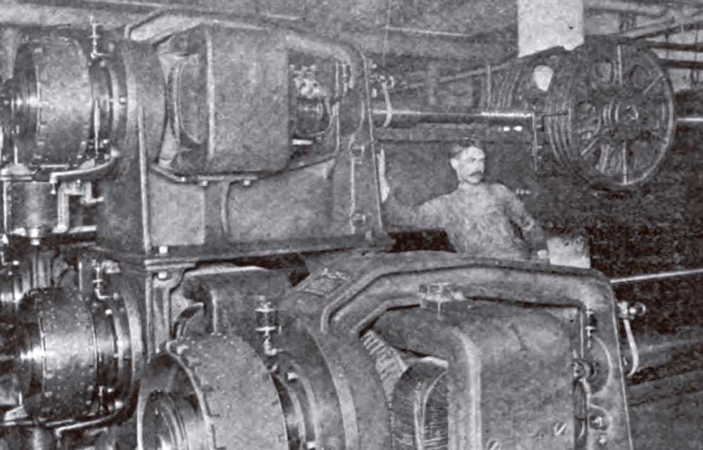 Although no details regarding Bolton’s “improvements” have survived, sufficient information remains that illustrates the complexity of the building’s engineering challenges. The plan of a typical upper floor reveals the elevator placement with two three-car elevator banks facing each other (Figure 1). When the building opened in 1896, only five shafts contained elevators. (The sixth elevator was added in 1899.) The plan of the building’s mechanical room reveals the overall character of the space and the size of the Sprague-Pratt elevator machines, each of which was more than 25 ft. long (Figures 2 and 3). As was noted in Electrical World’s description of the installation, two sets of machines were arranged in a double-deck fashion to save space (Figure 4).