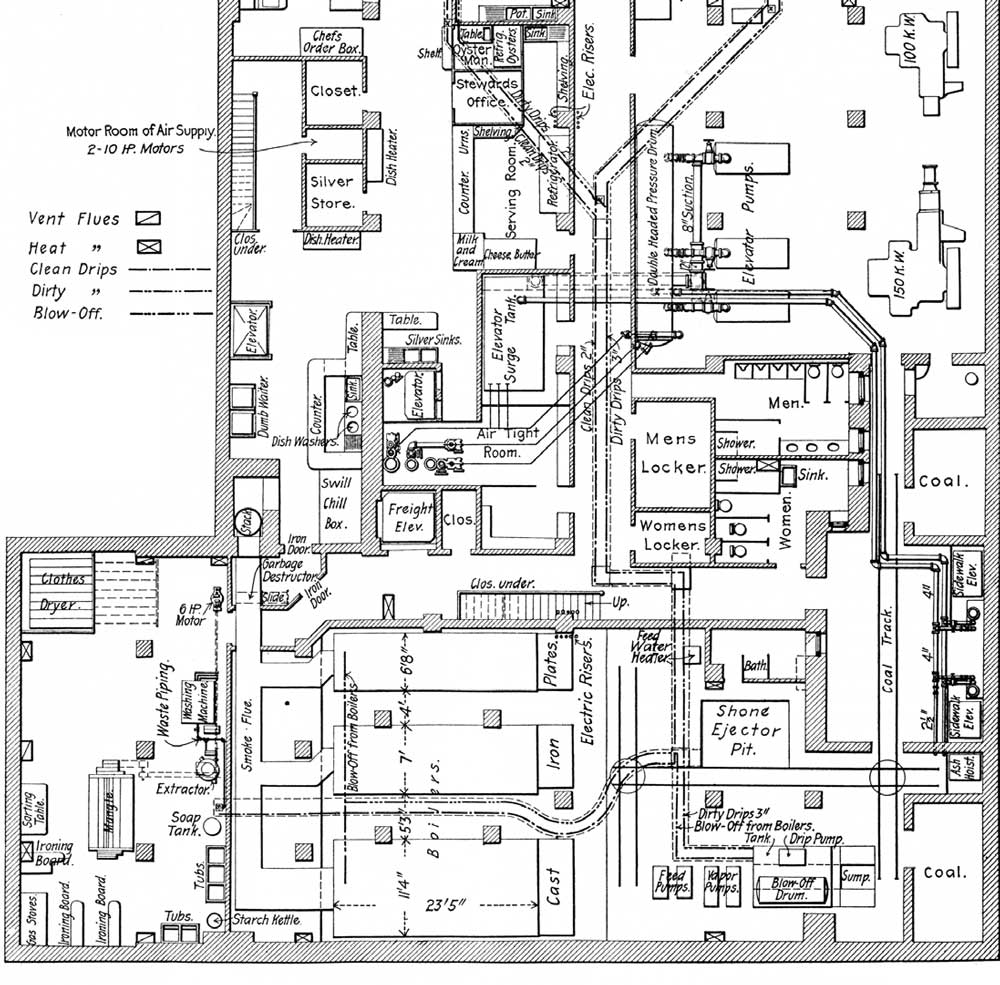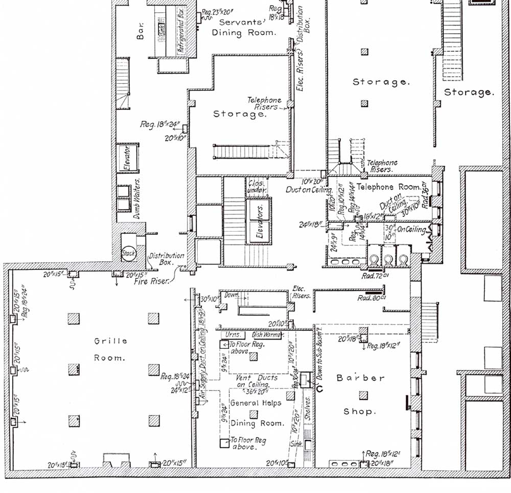 Although a typical upper floor plan has, apparently, not survived, plans depicting the building’s basement and subbasement exist that permit an examination of the various mechanical systems. The basement plan indicates the location of the passenger and freight elevators, as well as the dumbwaiters (Figure 5). Two versions of the subbasement plan exist: one that primarily addresses the overall organization of the mechanical spaces, plumbing and various hotel functions housed on this floor, and one that addresses the building’s ventilation and steam piping systems.
