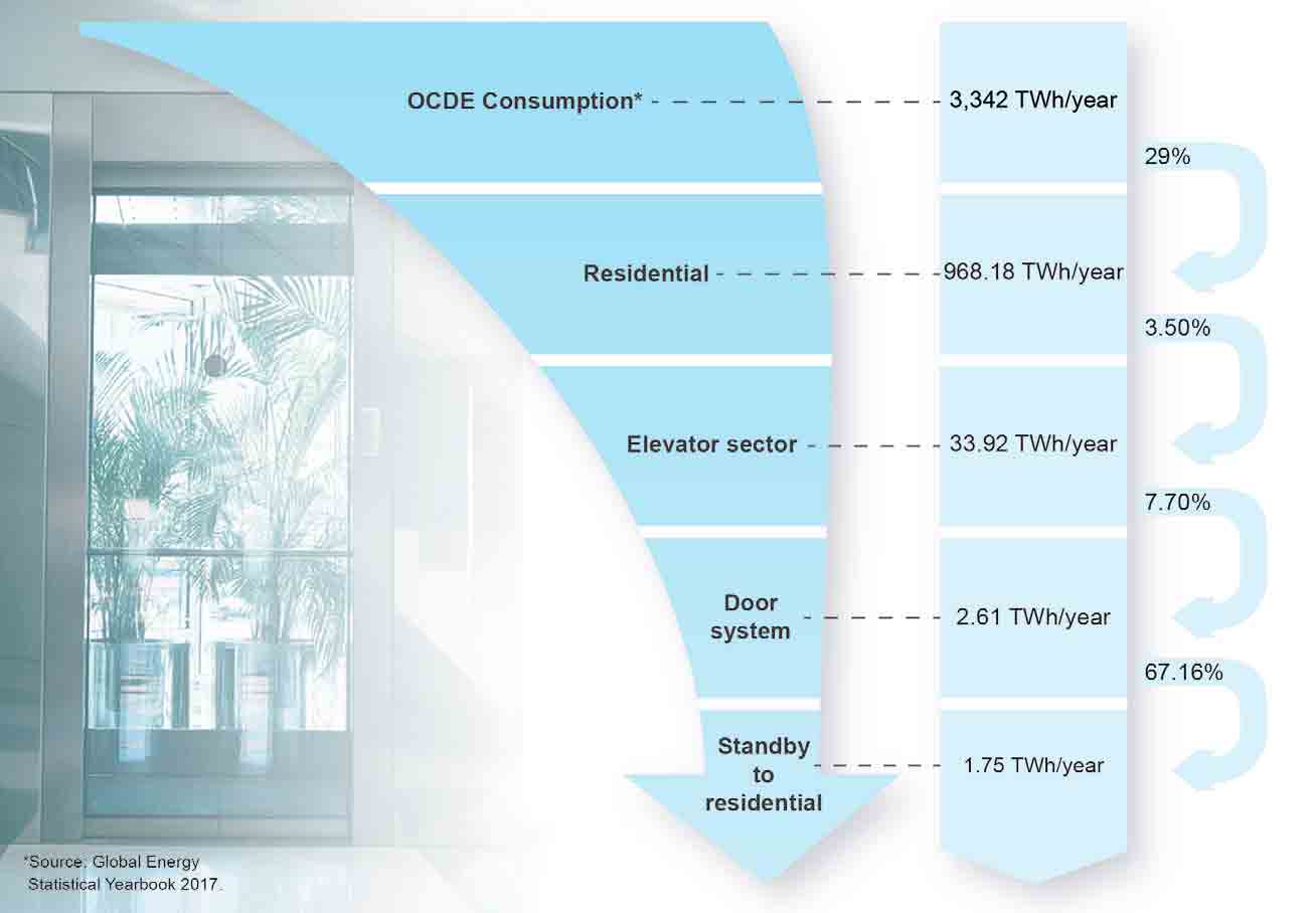 In order to understand the steps taken to save energy in either open or closed door positions, it is necessary to quantify the energy currently consumed in doors. “Elevators and Escalators Energy Performance Analysis”[6] proposed a scenario called “Best Available Technologies” to reduce energy consumption when in standby mode. Areas considered include the lighting system, electronic controllers, drive inverter and door operator. The analysis allocated consumption quotas for each of these elements and for the door operator. This share reaches approximately 7.7% of the total consumption. For OCDE members, the energy consumed in door control while in “standby state” in 2016 is shown in Figure 2.