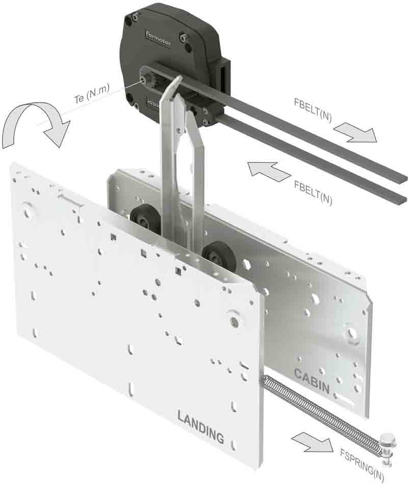 Figure 3 shows a cabin and landing door system with its “forces” diagram to illustrate that the ideal situation is reached when FBELT and FSPRING are equal. An imbalance between these forces leads to either loss in the open or closed door position (FSPRING > FBELT) or energy losses by the Joule effect in the drive and motor (FSPRING < FBELT).