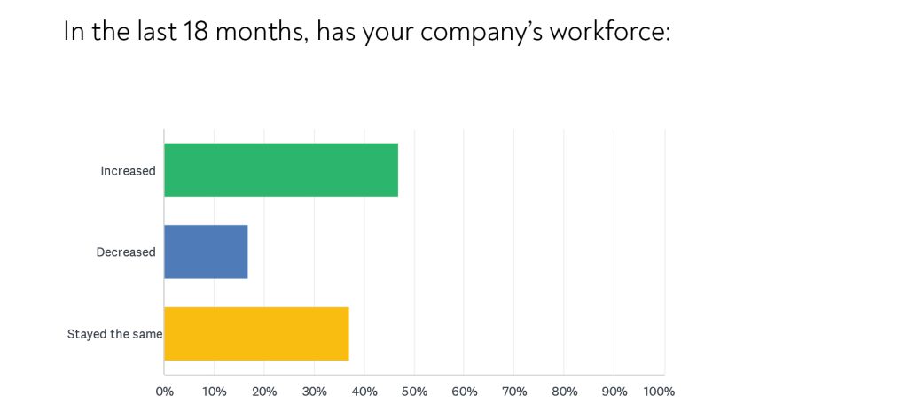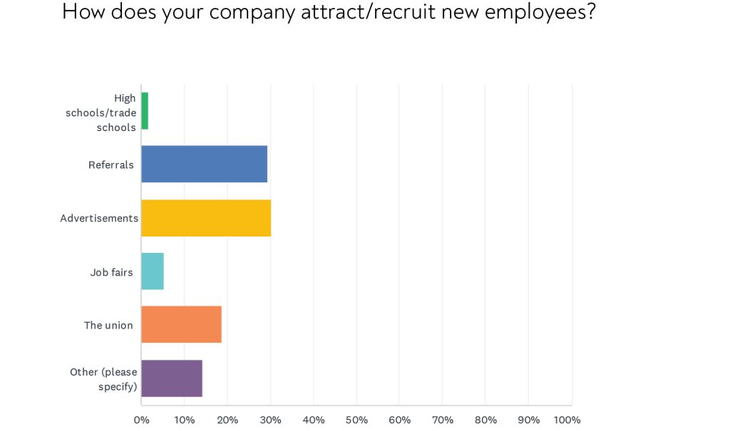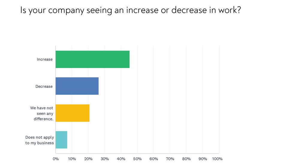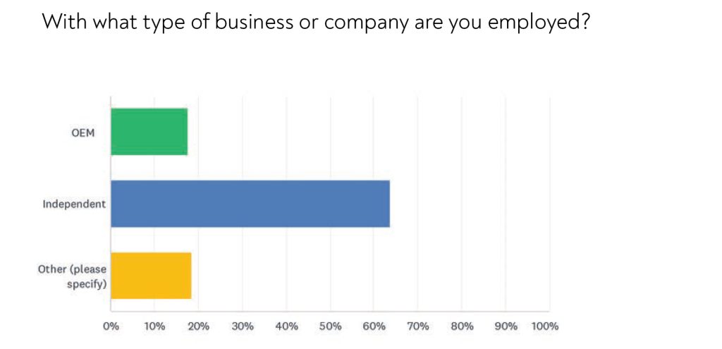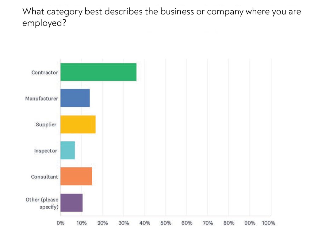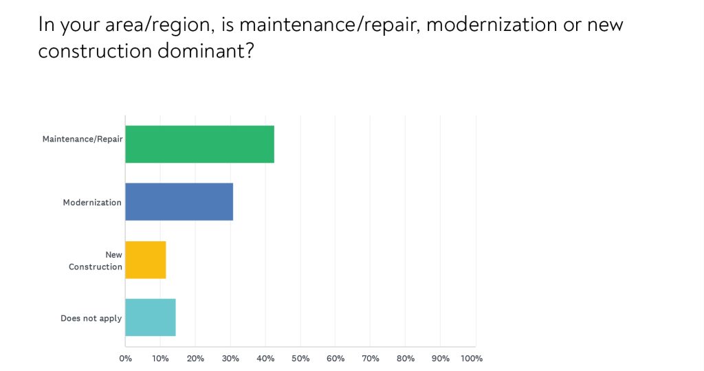 Most respondents — more than 45% — expect an increase in work, compared to 21% who expect no change and more than 26% who expect a decrease. Regardless of geographical location, maintenance/repair is the main business driver for most, approximately 43%, as new code requirements go into effect and property owners — much like automobile owners — want to hold on to what they have and make sure it lasts and is safe. One respondent said he’s seen a greater emphasis “on keeping existing equipment running, so maintenance and repair have increased, along with modernization.”
