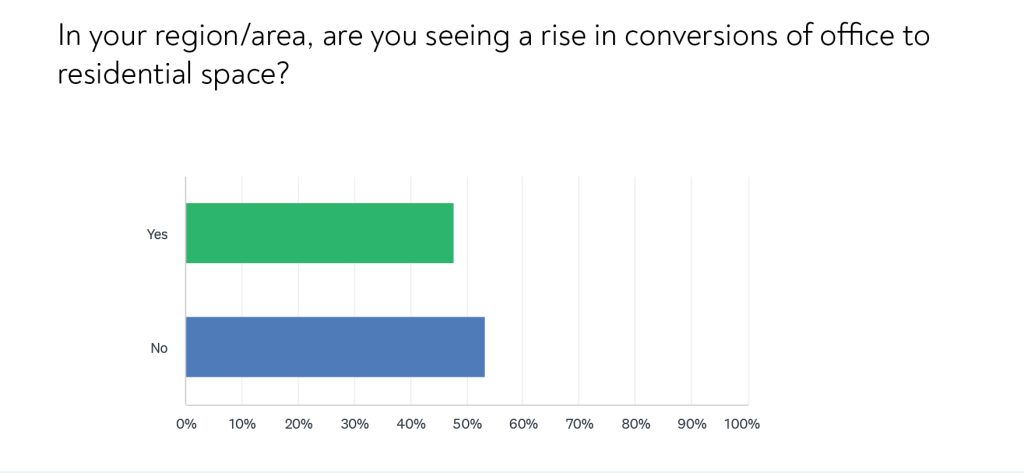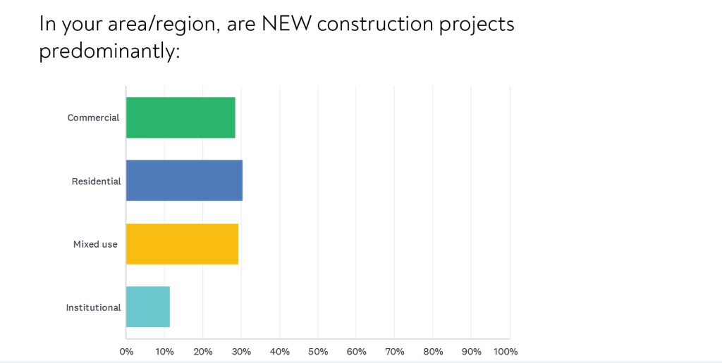 Another added that modernization is also being fueled by office-to-residential conversions. “New construction is a bit quieter compared to the other two, as many are focusing on upgrading what’s already there rather than starting from scratch,” the respondent said. What new construction VT work there is is primarily residential (more than 30%), followed closely by commercial and mixed use at approximately 30% each. Institutional work accounted for only about 11% of respondents’ new construction work.