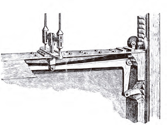 The pawls were also made of “heavy iron,” and, when “forced. . . into contact with the safety ratchets” were “capable of sustaining the entire weight of the car” and its load. Because the ratchet teeth were spaced at 3-in. intervals, Otis also described this safety as “a mechanical device for reducing to 3 in. the distance which it is possible for the car at any time to fall, in case of breaking of the lifting ropes.” In the early 1870s, Otis produced a perspective drawing that illustrated the safety’s various components (Figure 4).