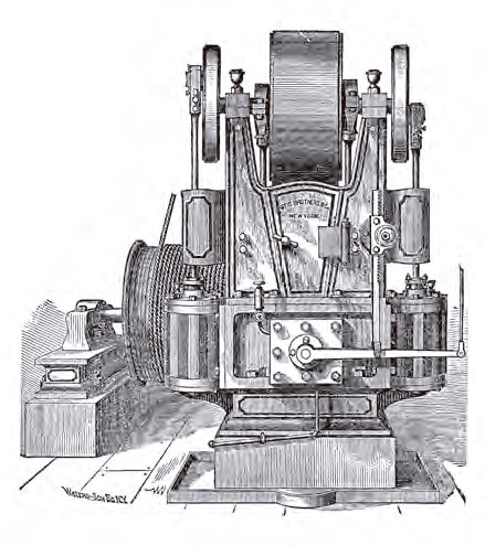 The winding drum was described as made of iron, “carefully finished” and “grooved spirally to fit the coil of the wire cable when wound upon it, keeping the surfaces of the latter from contact and friction and unnecessary wear.” The results of these patents included Otis’ National and Metropolitan hoisting engines, with the hoisting engine depicted in the 1870 engraving resembling the National engine design (Figures 2, 7 and 8).