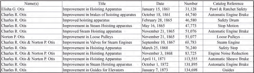 The pamphlet’s text provided a detailed description of the elevator and concluded with the observation that the design illustrated in the drawings was covered by 12 different patents. The latter fact was emphasized by references to individual system components, which included the company’s Patent Safety Lock Ratchet with Self-Locking Pawls, Patent Double Acting Safety Drum, Patent Automatic Stop Motion, Patent Self-Acting Brake and Patent Self-Oiling Loose Pulley. In addition to these components, the 1869 catalog also referenced Otis’ Patent Safety Sheave and Brake and Patent Safety Stop Connection. It is, in fact, possible to find a patent reference for almost every aspect of Otis’ 1870 elevator. A survey of the American patent record identified 17 patents awarded to members of the Otis family between 1860 and 1873, and, as noted above, 12 applied to Otis’ new elevator (Table 1). Although this end date falls after the pamphlet’s publication, it was selected because the final patent associated with this passenger elevator was issued in January 1873. This collection of materials (the 12 patents, the 1869 catalog and the 1870 pamphlet with its remarkable set of engravings) allows a thorough investigation of Otis’ Patent Safety Passenger Elevator.