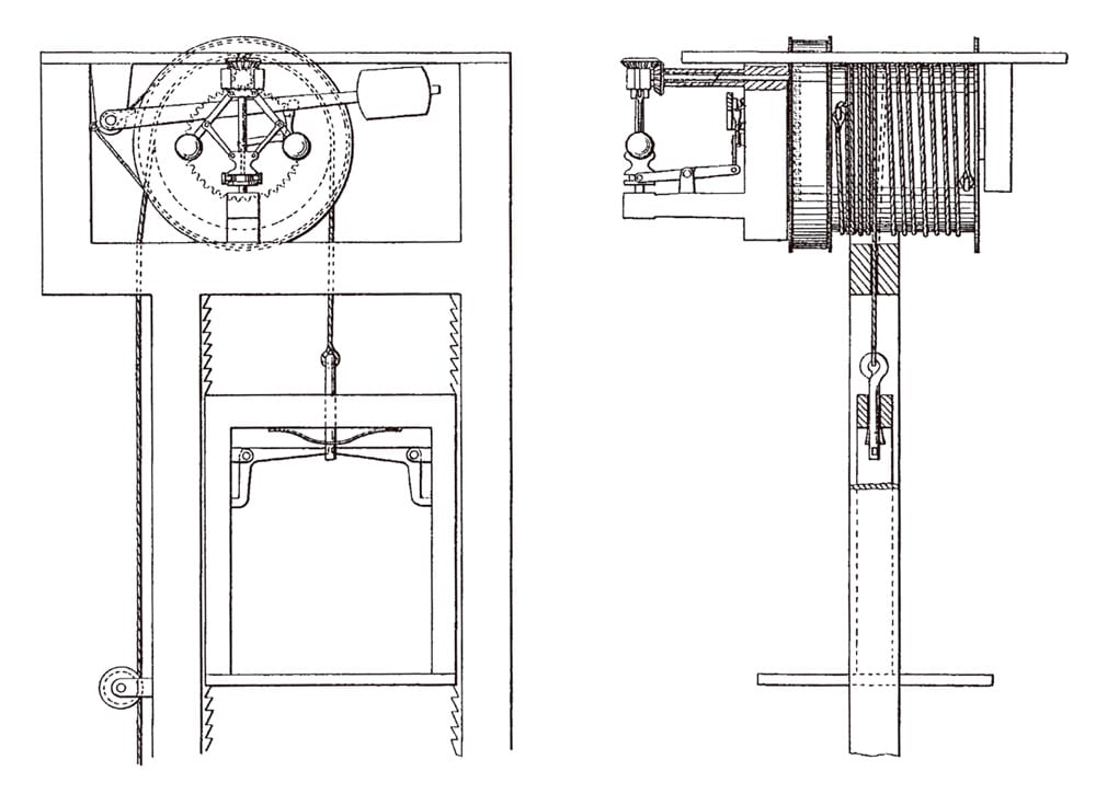 An examination of the drawings clearly reveals the safety drum (seen in elevation and plan view) (Figure 4). These drawings also depict another safety device: Otis’ automatic sheave brake or safety sheave, which was operated by the second brake referenced in the 1869 catalog. The operation of this safety was described in Otis’ 1870 pamphlet as follows: