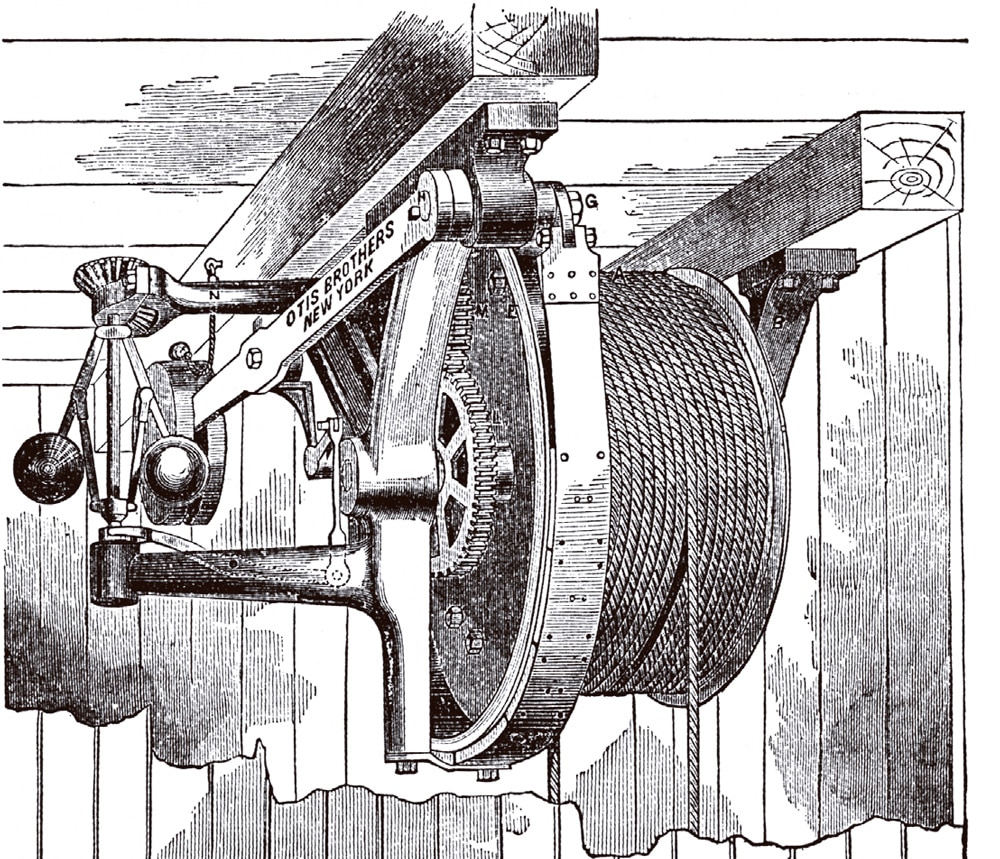 This is the conclusion of a two-part article (which began in ELEVATOR WORLD, January 2017) that examines the first U.S. publication of a set of drawings that depict a passenger-elevator installation from basement to penthouse. The drawings first appeared in a pamphlet published by Otis Brothers in 1870: Description of Otis’ Patent Safety Passenger Elevator (Figure 1). Part one of this article examined the steam hoisting engine and associated safety brakes, the winding-drum stop limit safety, Elisha Otis’ original ratchet-and-pawl safety device, the guide rails and the car running gear. This article will conclude this investigation with an examination of Otis’ patented safety drum and automatic sheave brake, and the drawing’s publication history in the early 1870s.