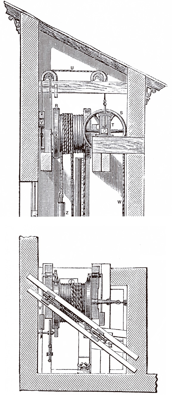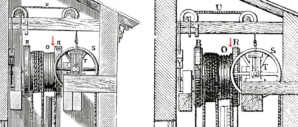 The drawings appeared for a third time in 1874 in the British publication Spons’ Dictionary of Engineering. They appeared in a section titled “Lifts, Hoists, and Elevators,” which illustrated a range of elevator systems (including other Otis machines). While the accompanying text was, again, a reprint of the 1870 pamphlet, the drawings were, apparently, redrawn for this publication (Figure 5). The “new” drawings are easier to read (compare the legibility of the counterweight as seen in Figures 1 and 5), and they contain an error. A close examination reveals that the British engraver added a rope to the top-right side of the winding drum, making it appear as if both hoisting ropes passed over the safety drum (Figure 6). This mistake may indicate that the engraver did not understand the operation of Otis’ elevator; thus, he was attempting to “correct” a perceived error in the original drawing.