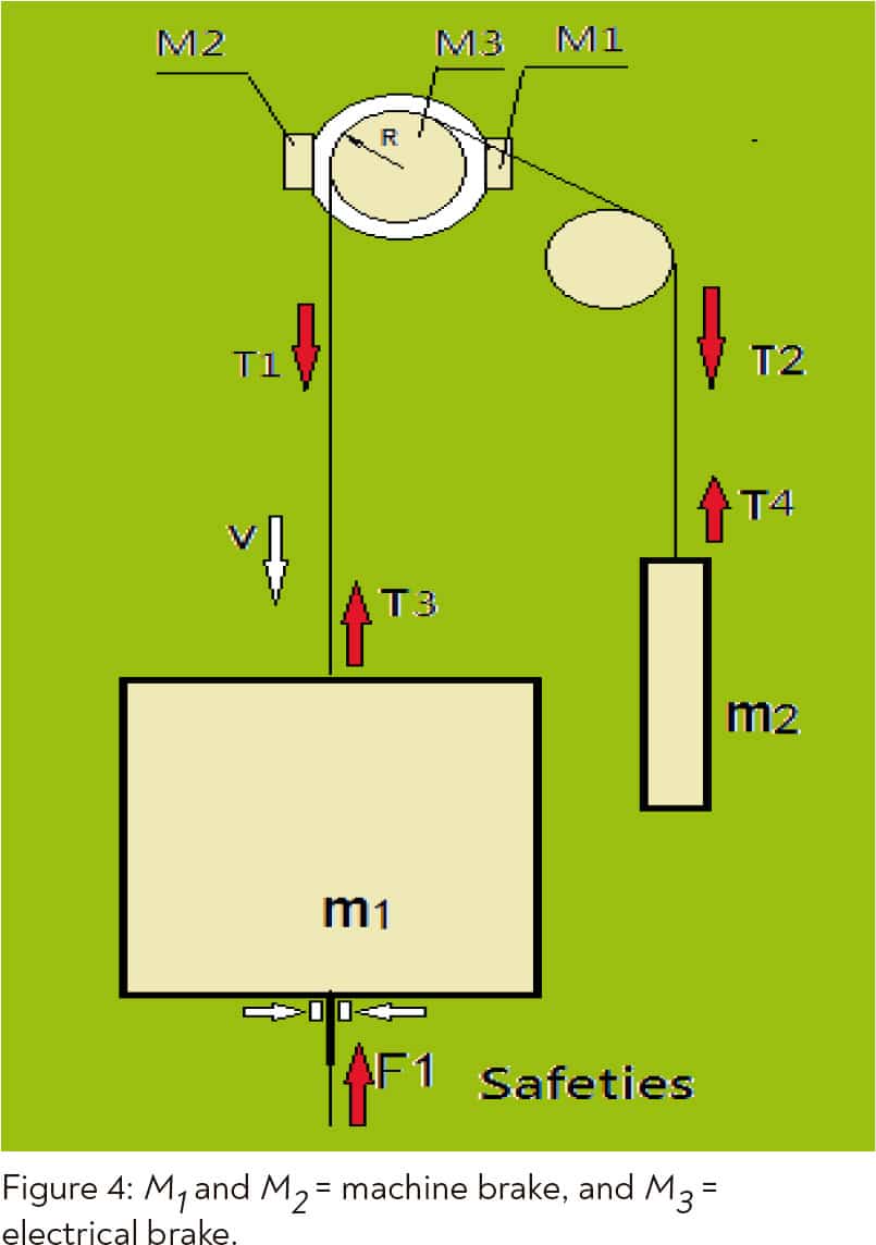 J is the machine’s rotational inertia; F1 is the safeties’ braking force; R is the nodal circle radius of the traction wheel; a1 is car acceleration; and m1 is car mass.