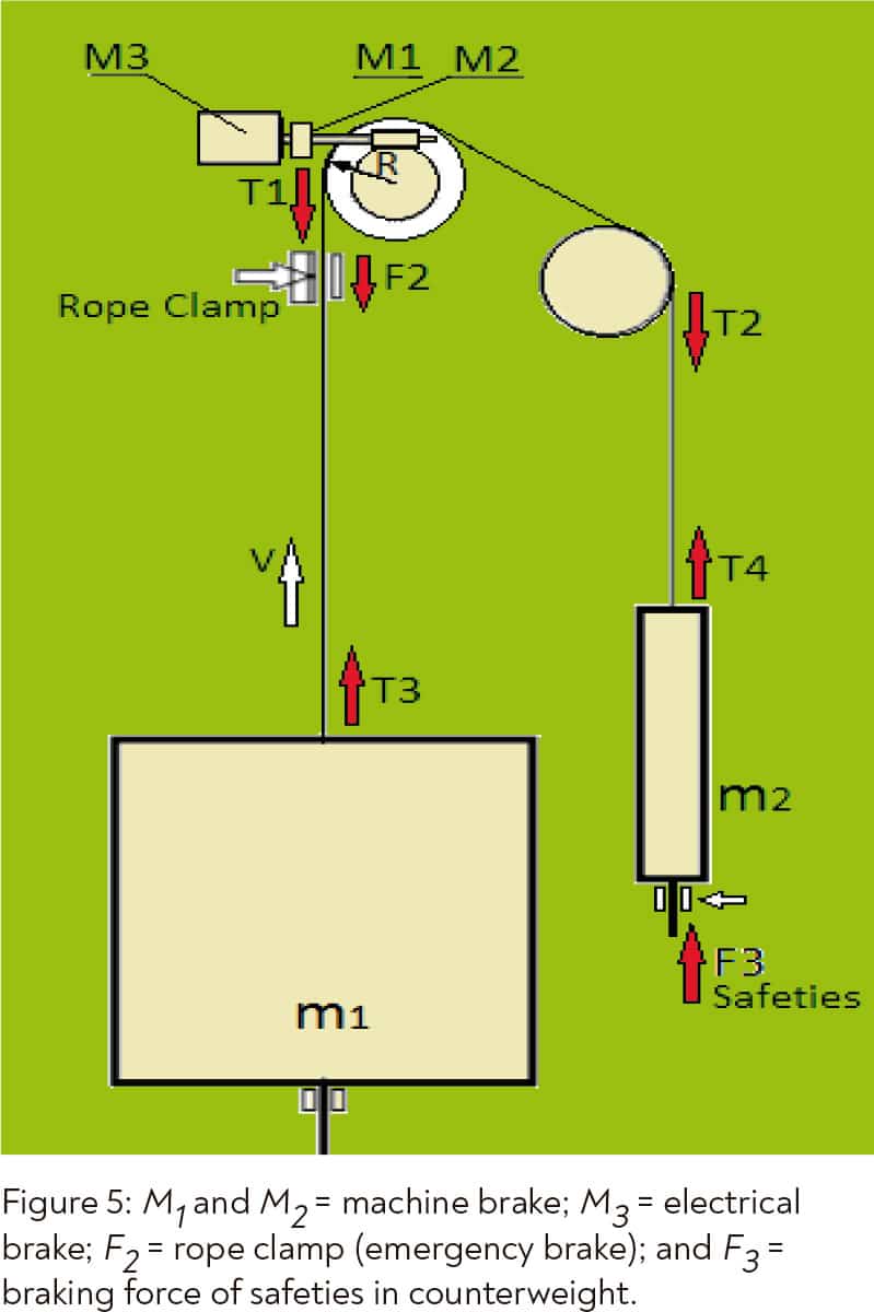 In the simultaneous action of the machine brake, electric brake, emergency brake and safeties downward (as in Figure 4), there are two situations to consider: