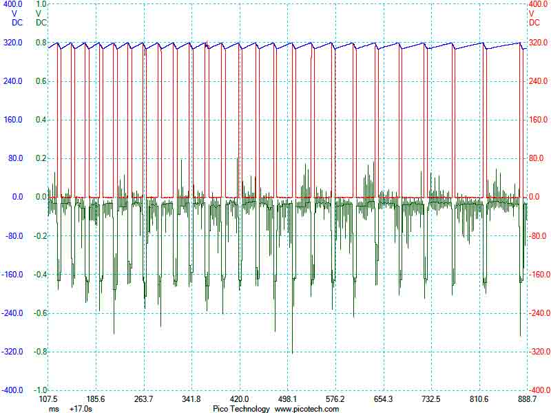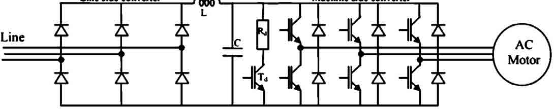 Besides the handling of the regenerated power, there are two more issues with the circuitry. The normal operation of the inverter very much depends on the healthy DC bus with a designated voltage. Suppose there is a sudden drop in voltage with the DC bus: in this case, the operation of the drive would be seriously disturbed, possibly resulting in tripping of the drive. One more issue is that the three-phase converter draws current from the grid intermittently, because current can only get through the diode(s) when the instantaneous three-phase line voltage is higher than the voltage on the DC bus. This characteristic produces a very poor power quality at the grid, which must be addressed.
