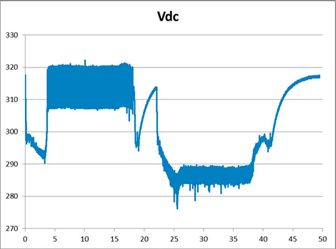For voltage-dip ride-through, the power analyzer recognizes a voltage-dip event and instructs the DC/DC converter to temporarily retrieve power from the capacitor to feed the inverter-connected DC bus for the short period of time (not longer than 0.2 s.), thus avoiding tripping of the motor drive. It should be noted that the energy stored inside the 2,000-uF capacitor is not enough to support the inverter-connected DC bus to withstand a duration of 0.2 s. under a fully loaded up condition. It is expected that voltage dip with the three-phase supply is down only to 40% of the rated value, and the bidirectional active power filter can still charge the capacitor continuously as the DC/DC converter draws power out of it.