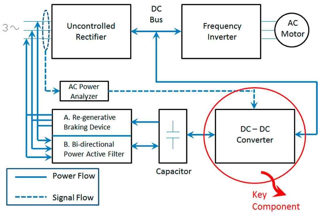 For regenerative braking, the DC/DC converter can then confirm this by two simultaneous means: first, checking whether the voltage of the inverter-connected DC bus is beyond, say, 110% of the rated value, and, second, more accurately checking the power drawn from the three-phase grid by the uncontrolled rectifier with the help of the power analyzer, which also continuously monitors other parameters, such as voltage, current, TPF, apparent power and harmonics, etc. to fulfill the requirements of the BEC. Once regenerative braking is confirmed, the DC/DC converter will extract power from the inverter-connected DC bus to boost the voltage of the capacitor to more than 110% of the rated value, then the bidirectional active power filter, to further extract power back to the three-phase grid.