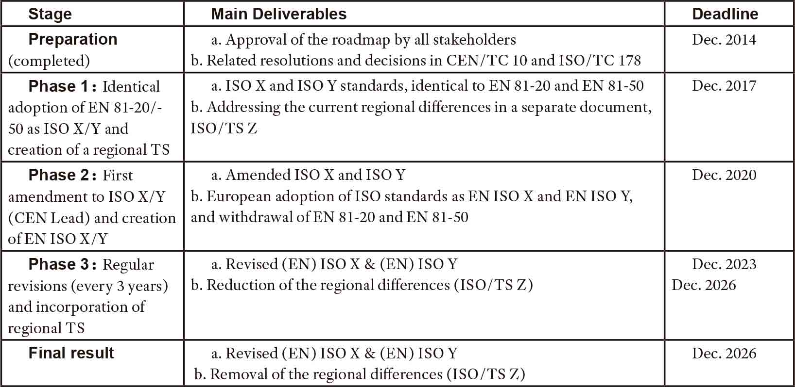 The Preparation phase and Phase 1 of the process include identical adoption of EN 81-20 and -50 as ISO X and ISO Y, and creation of a regional Technical Specification as ISO/TS Z (see item 7 below) with a completion date of December. Several tasks need to be completed:
