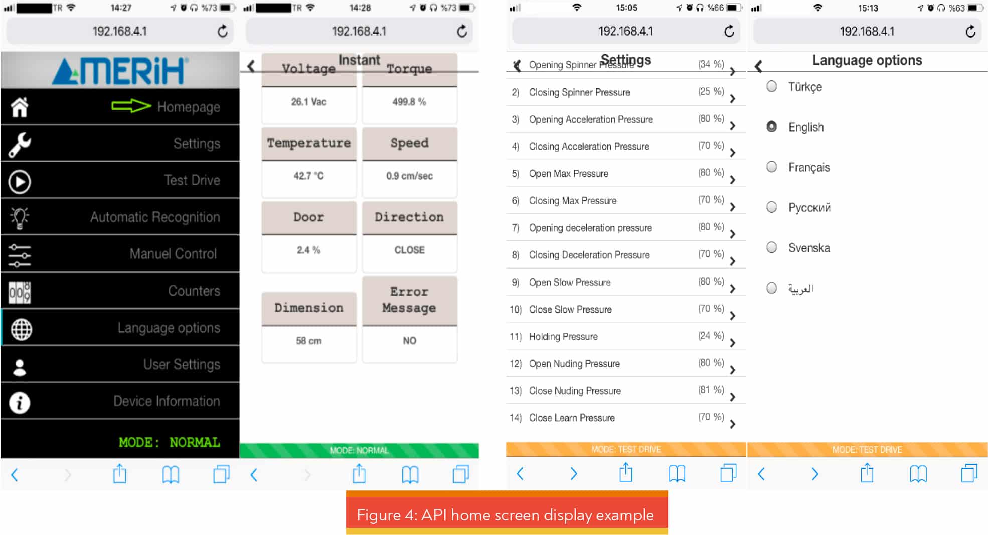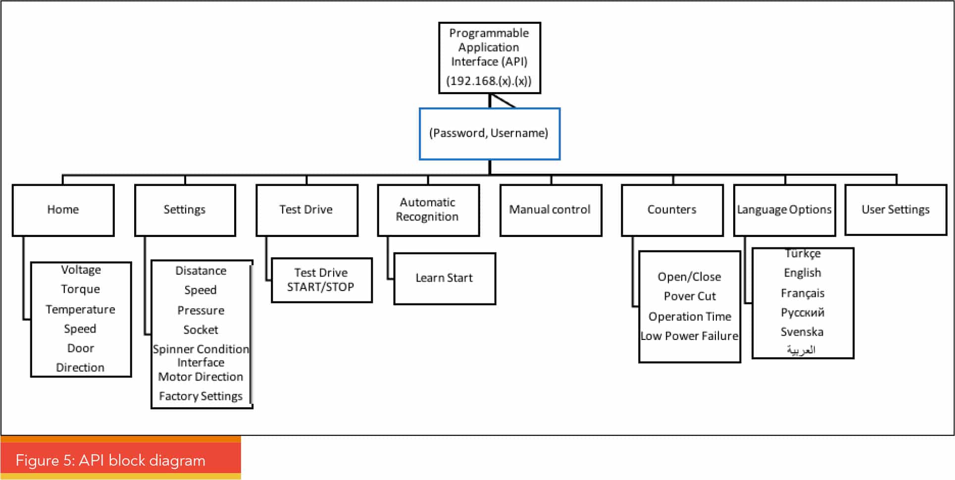 Figure 5 shows the block diagram of the device’s API menu. The movements of the door can be controlled by the settings in the device. The best possible comfort values of the door may be achieved by adjusting the variables in this interface. The device supports six languages and shows real-time information about voltage, torque, temperature, speed and door direction on the opening screen. Variables that need to be defined depend on the properties of the door to which the device is installed and are arranged in the settings menu.