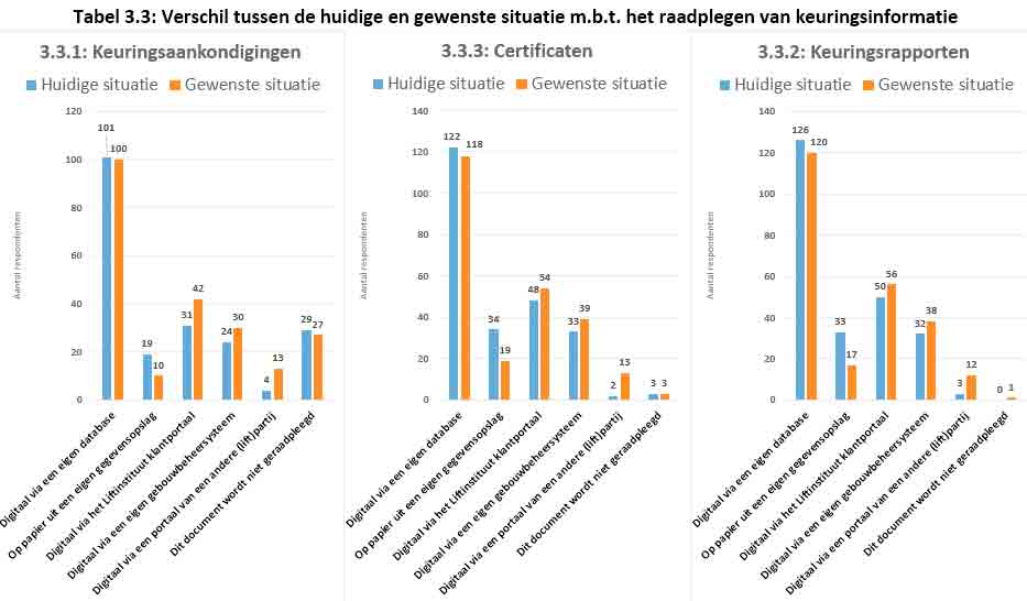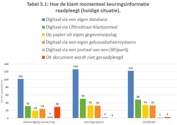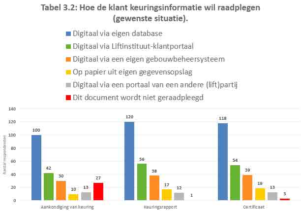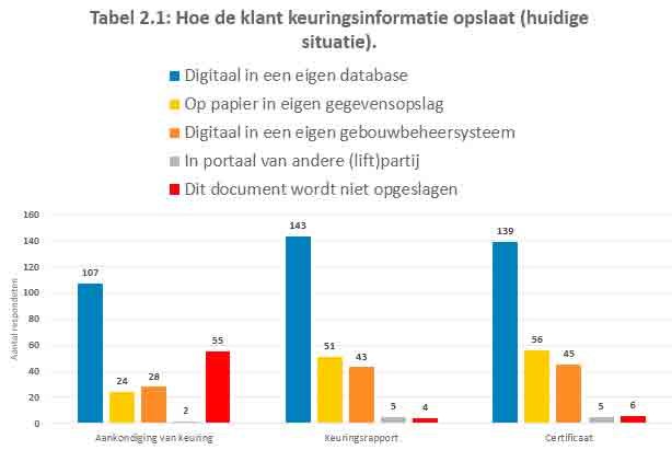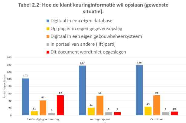 Half of the respondents who indicated that they currently store inspection data in paper format indicated that they want to store inspection data differently in the future. The vast majority of them indicated that they want to store inspection data electronically in their own database. Also, there is an increasing need to store this digital inspection data in a building management system. A striking discovery is the little need to store inspection data from Liftinstituut into another (lift-related) party’s portal. Only six of the 192 respondents (3%) opted for this.