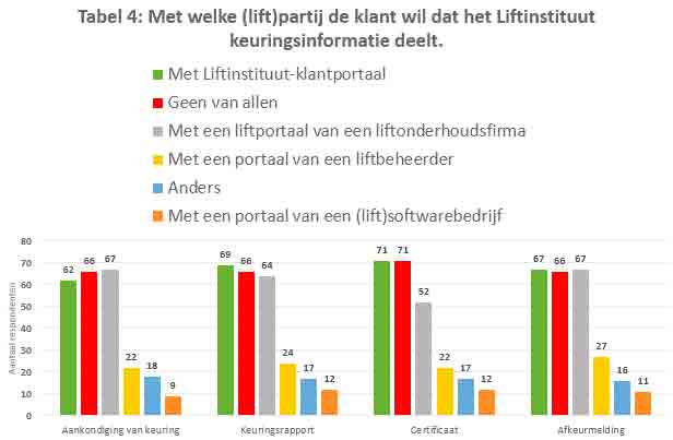 One-third of the respondents (67 out of 200) do not want Liftinstituut to share inspection data with other (lift-related) parties. Another third of the respondents want Liftinstituut to share inspection data with lift maintenance providers’ portals. The striking part is that the other (lift-related) parties’ portals are a lot less popular among the respondents. The portals of (lift-related) software companies are the least popular. Only 11 out of 200 respondents want Liftinstituut to share inspection data via these portals.