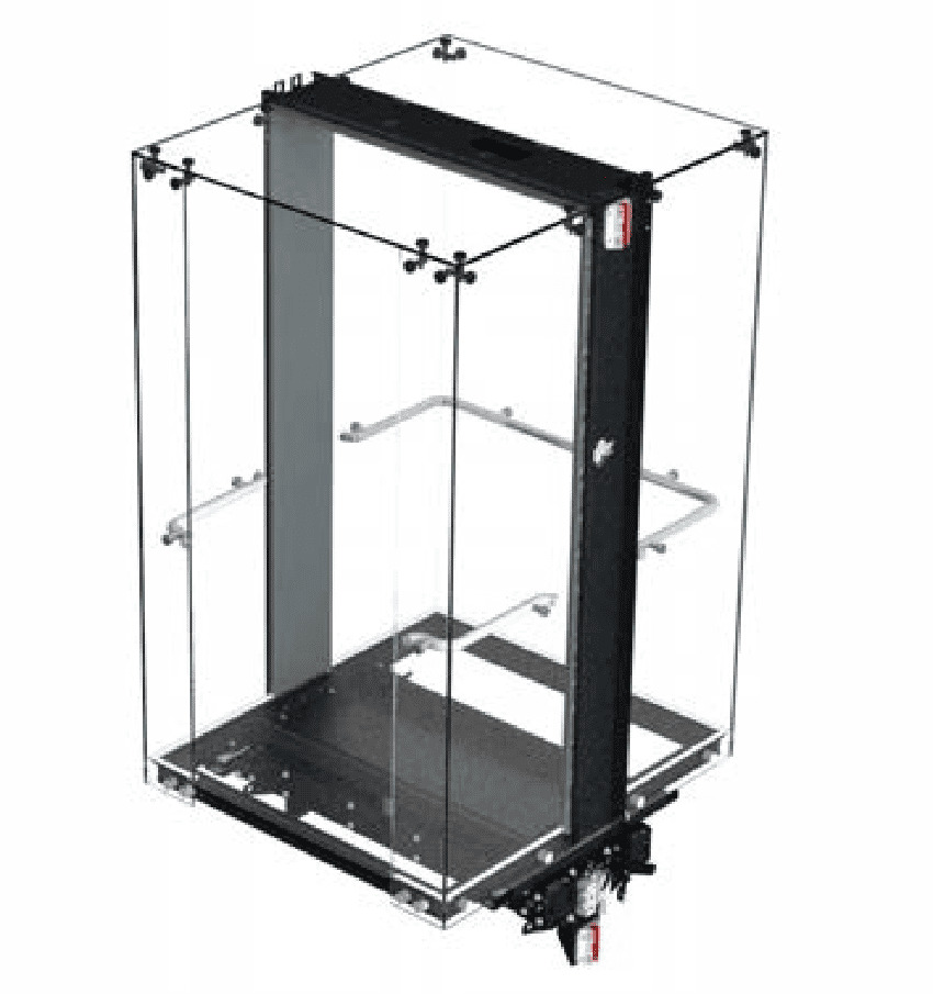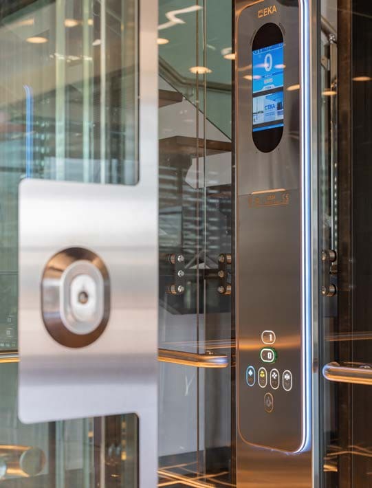 The cabin was designed with a viewing angle of more than 90°. In order to increase the aesthetics of the structure housing it, the cabin floor and ceiling were also made of glass, ensuring integrity with the glass well walls. In accordance with EN 81-20/50 standards, a portable work area and railing system were designed for maintenance work to be carried out on the cabin. To preserve visual aesthetics, no external equipment was positioned on the cabin ceiling except for use in maintenance and malfunction situations.