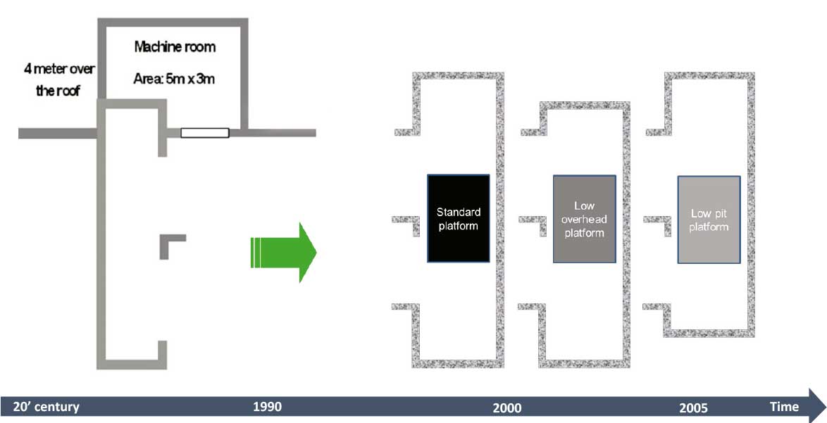 Since the aforementioned advent of MRL elevator systems in the 1990s, which was made possible thanks to the European Lift Directive, the elevator industry has observed some growing market demands to increase hoistway optimization, resulting in the emergence of systems providing low overhead or low pit.
