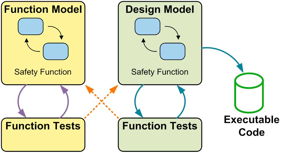 Two models are derived from the requirements written in natural language: one with the focus on functional behavior — a functional model, and the other with the focus on implementation — a design model. First, both models are analyzed, executed and tested separately to check the design correctness. Here, an automated test-case generation supports the design-verification task, and aspects of coverage analysis are considered. In a second step, both models are executed with the same test vectors, and the execution result of both models are checked for consistency. In a third step, the test cases generated from the functional model are executed on the design model, and the test cases generated from the design model are executed on the functional model to validate the design. This last step is repeated using the executable code generated from the design model to verify and validate the generated software code. Additional tests are performed on the generated software code to cover the full aspects on testing of safety-related applications as indicated in the standard for safety electronics and other state-of-the-art literature.
