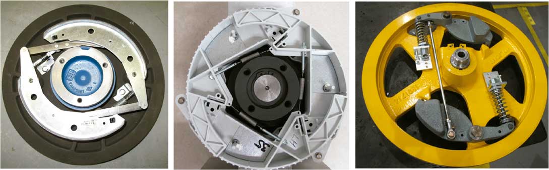 Another relies on a high-friction rope groove geometry in the governor sheave (e.g., V-groove). When the sheave is abruptly stopped at the trip speed, it generates higher tension in the rope above the actuating lever connection than below it. Yet another combines a reduced contribution from the method of the previous approach using a round governor-sheave rope groove instead of a V-groove. In this design, most rope tension imbalance derives from forcing a single concave radiused spring-loaded cam or jaw against the rope wrapped around the governor sheave as shown in Figure 6.