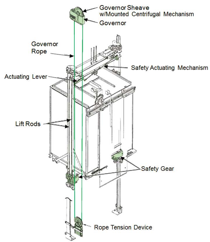 - Hoistway efficiency: The overspeed governor must be installed either in the hoistway or on the car for MRL systems, or in the machine room. In all cases, a steel rope is needed for routing through the governor. The rope connected (typically to the cab) via a safety linkage actuating lever, and a governor-rope tensioning means is required. Last, the safety gears installed on both sides of the vehicle must be linked with a synchronization linkage that obliges location of the safety gear above the car roof level or below the car platform level, jeopardizing the opportunity to achieve low-overhead or low-pit systems, respectively.