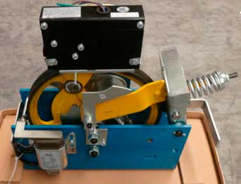 In all described configurations, one of three techniques is used to create a net “lifting” force to the actuating lever and subsequent motion of the car-mounted mechanism that leads to movement of the wedges or rollers of the safety gears and engagement with the guide rails, decelerating the car. The most popular technique uses a parallel jaw arrangement. At the required speed (i.e., trip speed), a moving jaw is positioned opposed to the spring-tensioned fixed jaw, applying a clamping force to the moving governor-rope portion above the actuating lever connection. Consider the example below.
