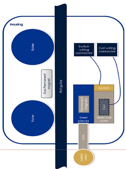 When necessary to engage the safety gear, the SAB energizes the coil to produce, within milliseconds, an electromagnetic field with the same polarity as the PM assembly, creating a repulsion force between both and deploying the PM assembly against the rail, due to the normal force created by the magnetic attraction of the PM assembly to the guide rail. When the car is moving, a friction force is generated, braking the PM assembly and transmitting a force through the link up to the safety gear’s wedge/ rollers upward relative to the descending elevator car to result in its engagement (Figure 8).