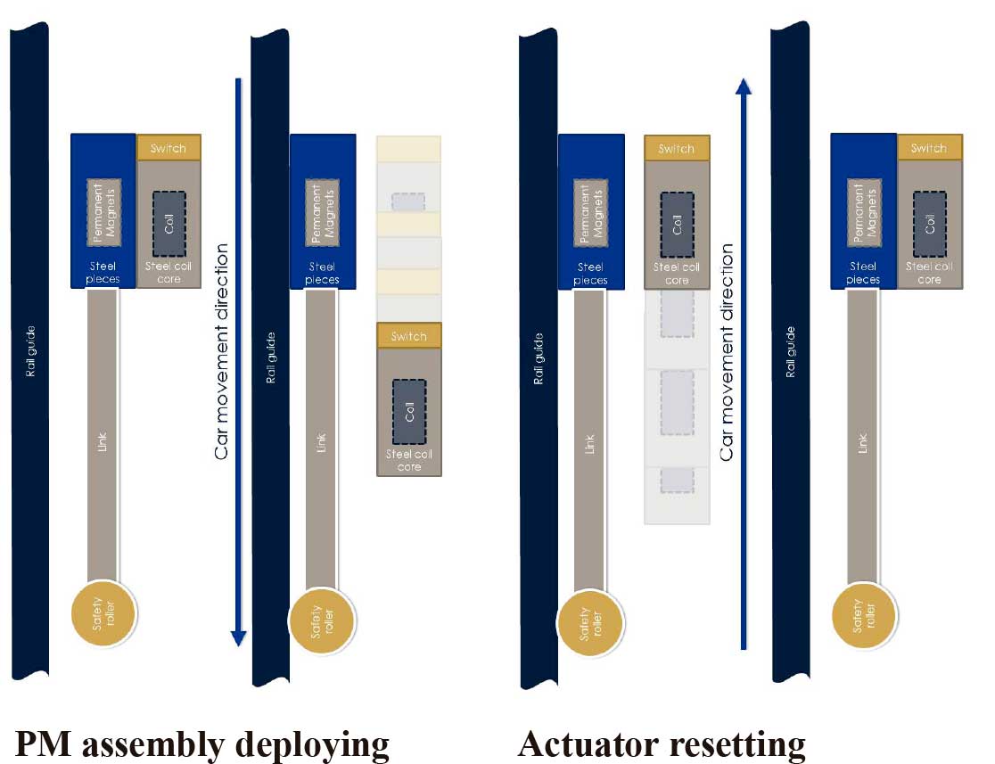 Barriers to new ideas are means to generate the forces to engage safety gears of various sizes in a synchronized way within desired times, compared with the traditional “roped” systems. All combined, cost effectiveness proves an enduring challenge, but rapidly declining cost curves of applicable building-block components such as accelerometers, noncontact sensors, PMs, etc., and an increasing Internet of Things-centric approach and acceptance of electronic/software-controlled safety functions have initiated a resurgence in new ideas.