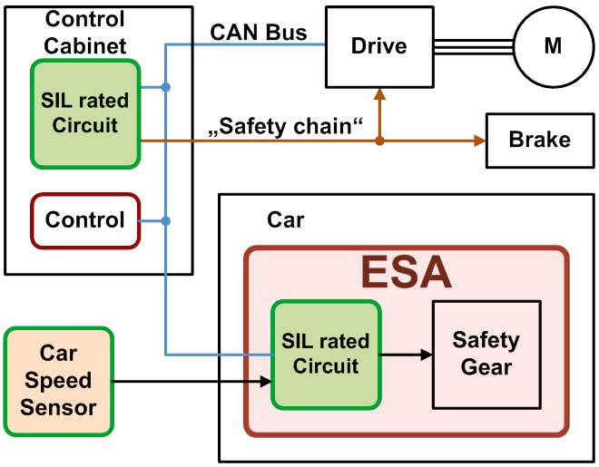 However, a pure replacement of the overspeed governor by an electronic one doesn’t answer all the safety requirements. Following a systems-design approach, the ESA is integrated into a distributed system of safety electronics extending the pure overspeed function into a set of interlocking functions. This distributed safety system is communicating over a serial bus to transmit both safety- and non-safety-related messages across the elevator control system.