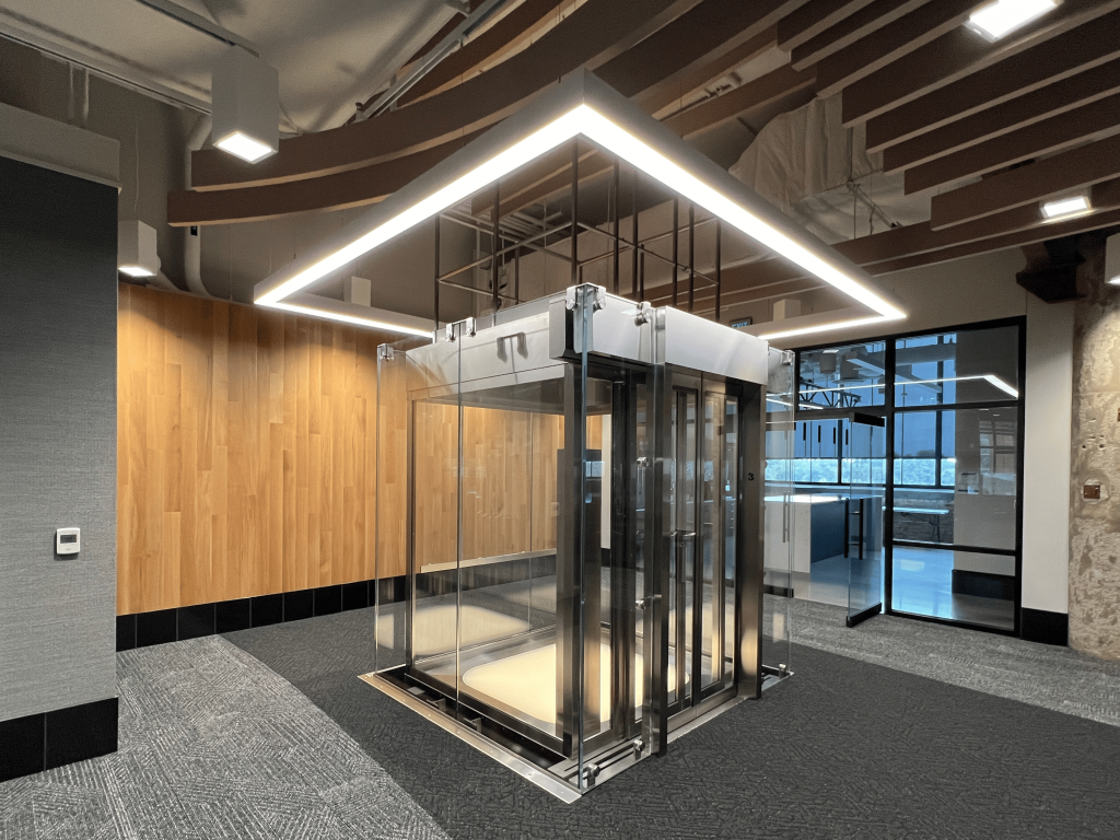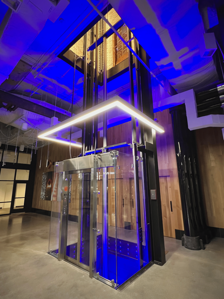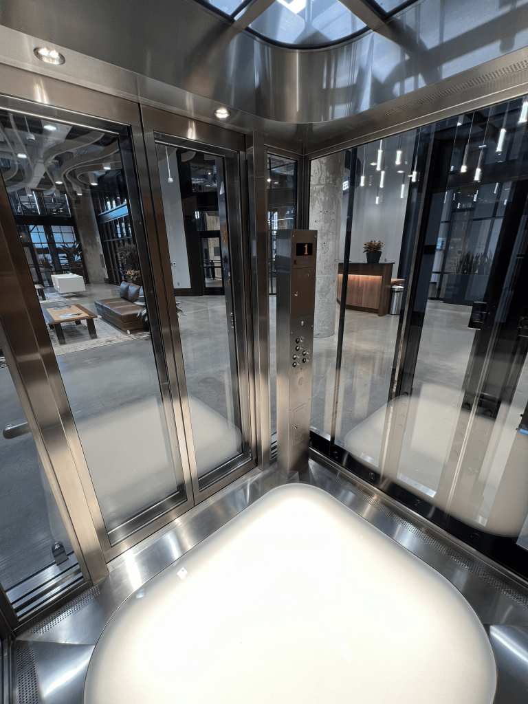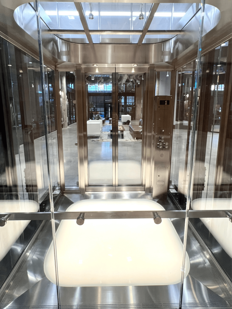 The glass elevator at Electric Works is more than just a mode of transportation; it’s a work of art that seamlessly blends form and function. At first glance, you’ll be drawn to its sleek design, featuring clean lines, transparent glass and stainless-steel accents. However, it’s the innovative technology hidden beneath the surface that truly sets this elevator apart.