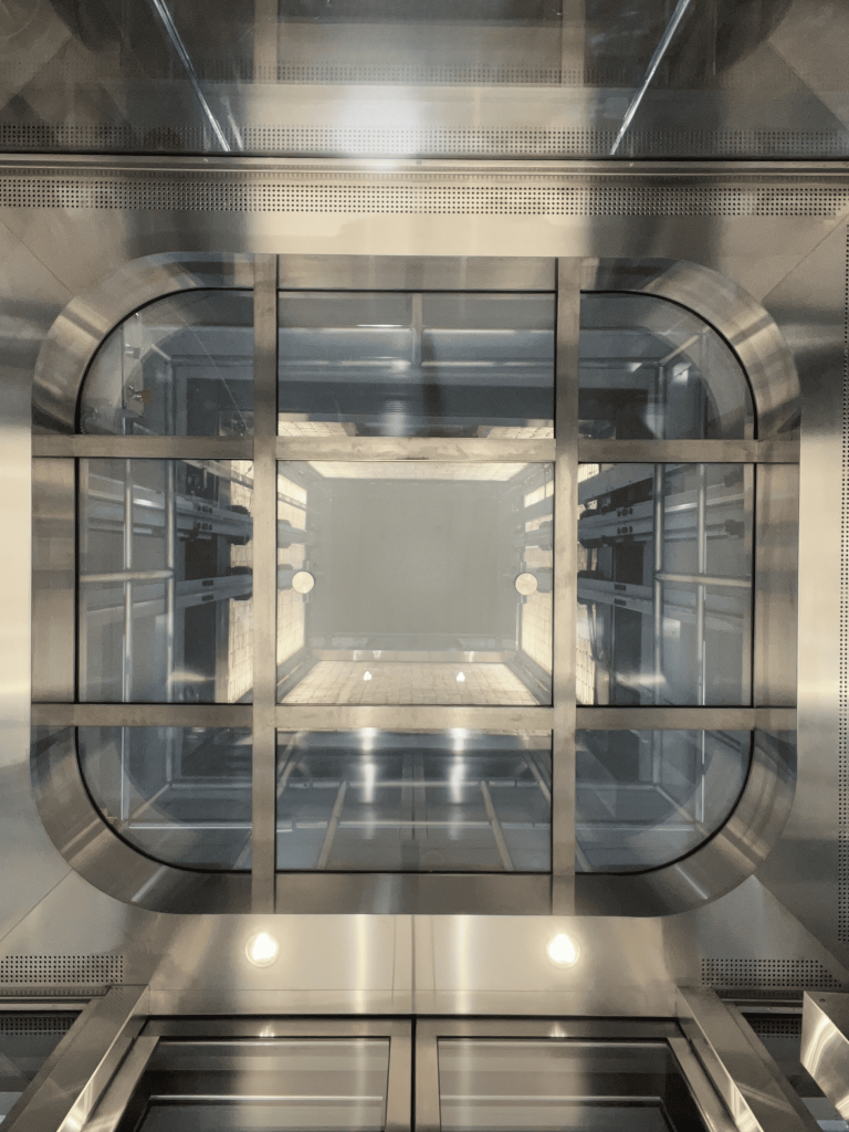 The elevator’s glass cab rests on a concealed pedestal, housing all the operational equipment such as a GAL MOVFR door operator in the shrouded platform below. This unique design eliminates the need for traditional guide rails attached to the glass frame, allowing for a more open and spacious feel. The elevator’s ascent is powered by an ITI Hydraulik three-stage telescopic hydraulic piston, smoothly gliding along rails mounted on SDI own steel I-beams.