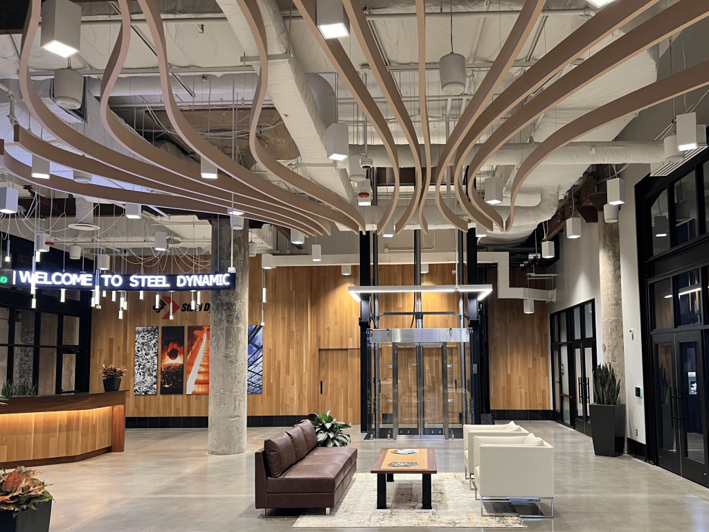 Steel Dynamics, Inc. (SDI), a leading U.S. steel producer, has transformed its Electric Works office space into a showcase of innovation. The company’s commitment to sustainability shines through its headquarters’ design, which features recycled steel elements and a focus on energy efficiency.