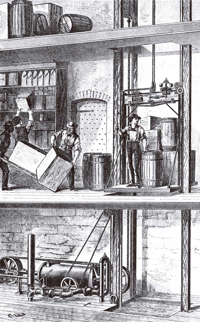 While the first article in this series (ELEVATOR WORLD, February 2019) focused on reporting and statistics, this article addresses the primary causes of accidents during this period. In addition to gathering accident statistics, several state and municipal agencies referenced in last month’s article also provided information on causes. An examination of the annual reports of the Office of Factory Inspectors for the State of New York from 1888 to 1893, the annual reports of the Chief of the Massachusetts District Police from 1886 to 1913 and a report prepared by the Public Safety Commission of Chicago and Cook County covering the years 1905 to 1916 yielded more than 1,000 accident descriptions. Most of the accidents occurred in factories, warehouses and other industrial buildings. Nonindustrial accident sites included hotels, department stores and office buildings. It is not surprising that most accidents occurred in industrial settings. Even in the 21st century, these settings remain more dangerous than nonindustrial workplaces, and the disparity between these two environments was significantly higher in the 19th and early 20th centuries. This was particularly true regarding elevator safety. However, the vertical- transportation industry’s well-known focus on passenger and operational safety, coupled with the steady development of new safety devices and other technological improvements, prompts the question, “Why were freight elevators more dangerous than passenger elevators?” The answer is simple. The invention of the passenger elevator was predicated on the transformation of the open-platform freight elevator into a system specifically designed to carry passengers. This transformation required the development of an enclosed car with doors and the presence of an operator (who played a critical role in ensuring passenger safety). The development of the passenger elevator was also marked by a continual refinement of these essential components and the invention of new safety devices, with the result being that the modern elevator of 1920 only slightly resembled its 1870 predecessor. This was not the case with freight elevators.