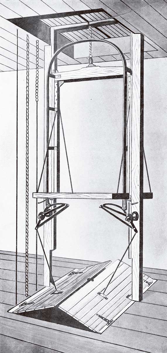 The number of accidents caused by workers jumping on and off platforms was greatly reduced by the implementation of effective shaft enclosures and gates barring easy access to moving platforms (Figure 5). However, once again, these new safety features were not without their own dangers. Because the gates typically only covered the lower half of a shaft opening, it was not unusual for workers to look into a shaft for an elevator. The typical behavior appears to have consisted of a quick glance upward, followed by leaning over the gate and looking down into the shaft to see if the elevator were ascending. If, however, the elevator were descending, the resulting accident typically resulted in serious or fatal injuries (Figure 6). It is of interest to note that very few accidents occurred due to mechanical failures. In fact, the primary cause of failure was not mechanical, but material, in nature: the breaking of hoisting ropes was the leading cause of accidents not due to human error.