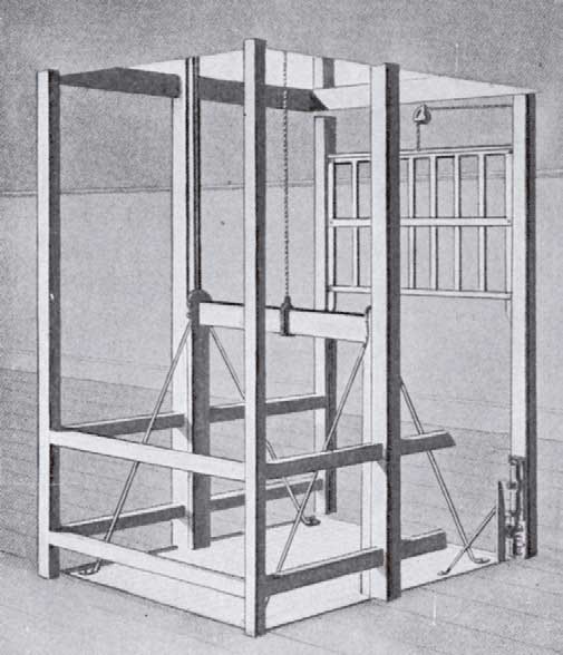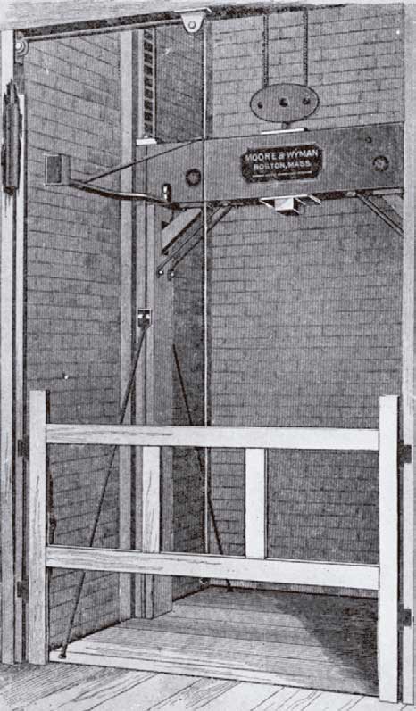 The design of the open platform freight elevator remained essentially unchanged from 1870 to 1920. In the 1870s, these elevators typically operated in open shafts and traveled through unguarded well holes (Figure 1). Trapdoors or hatchway covers, which were placed over hoistway openings, began to appear in the early 1880s (Figure 2). During this same decade, platforms began to feature walls on three sides, which ranged in height from 3-6 ft., with the fourth side left open to allow ease of loading and unloading freight (Figure 3). By the 1890s, many hoistways were enclosed, and gates were placed at the shaft entries. The enclosures were often relatively open wooden frameworks (although brick shafts were also common), and gates typically only covered the lower half of an opening (Figure 4).