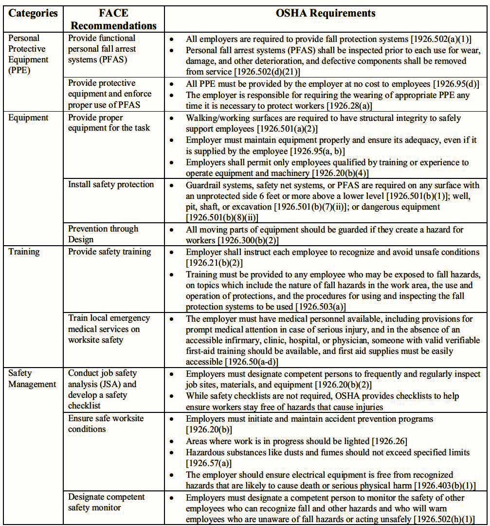 - Table 2: FACE recommendations and OSHA requirements to prevent elevator-related injuries and fatalities