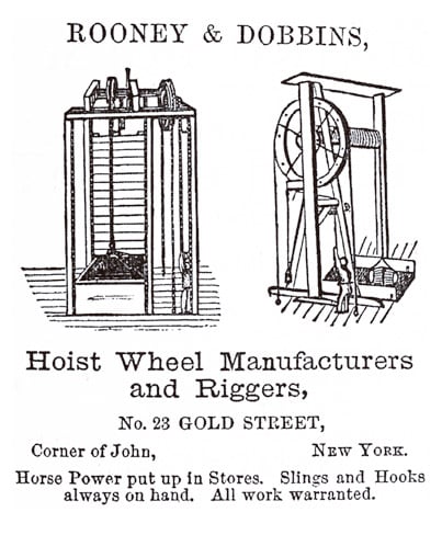 The 1867 advertisement for Alexander Thompson, who described himself as a “patent lever and improved friction roller & hoist wheel manufacturer,” included an illustration of a hand-powered hoisting machine (Figure 4).[7] While somewhat schematic in nature, this image accurately represented the act of hoisting, with the human figure grasping the rope in their hands. The image also appears to represent a machine similar in design (although seen from a different perspective) to that found in the Hagan advertisement. In fact, the engravings produced for the Hagan advertisement by L.B. Covert were recycled for an 1868 advertisement for Rooney & Dobbins (Figure 5). Remarkably, the advertisements for both firms appeared on the same page in the 1868 directory, with the images differentiated only in their graphic presentation (Figure 6). This set of images continued to be used throughout the 1870s in advertisements for different firms and served as generic representations of this technology.