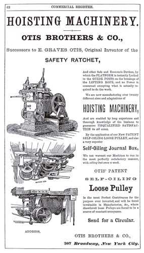 “Successors to E. Graves Otis, original inventor of the safety ratchet, and other safe and economical devices, by which the platform is instantly locked to the guide posts on the breakage of the lifting rope, and no power is consumed, excepting what is actually required to do the work. We are now manufacturing over 20 different sizes and adaptations of hosting machinery and are enabled by long experience and thorough knowledge of the business to guarantee unqualified satisfaction in all cases. By the application of our new patent self-oiling loose pulley, and also a very superior self-oiling journal box, we can warrant our machines to run in the most perfectly satisfactory manner, with oiling but once a week. Otis’ patent self-oiling loose pulley is the most perfect contrivance for the purpose ever invented and will be found invaluable in manufactories, etc. where disordered loose pulleys are found to be a source of constant annoyance.”[8]