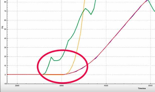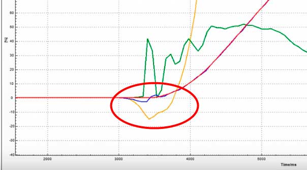 - Figure 2: Properly adjusted pre-torque settings show no rollback on the scope trace. The illustration shows command speed (red), motor speed (blue), motor torque (green) and motor position (yellow).