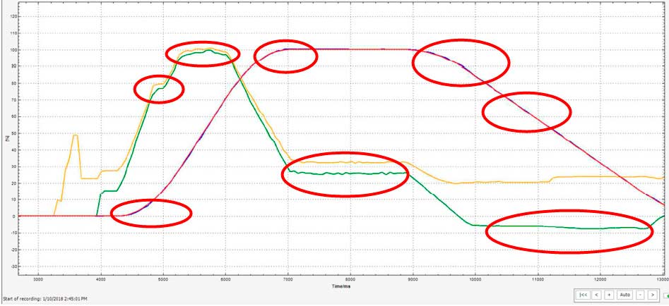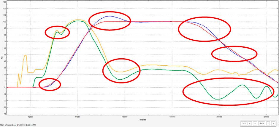 Significant amounts of undershoot and overshoot are present on both the acceleration and deceleration portions of the profile (circled). Additionally, these areas of undershoot and overshoot correspond to large torque bumps that can negatively impact ride quality.