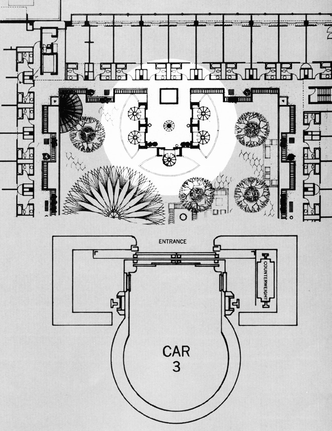 “The pastel-colored fiberglass domes atop the cabs conceal the crosshead, cable hitches, door operators and other gear. Add to this: recessed guide rails, safety devices tucked within the bottom companion to the upper dome and hoisting cables located out of sight within the shaftway, and one has the impression of space vehicles functioning without visible means of support.”