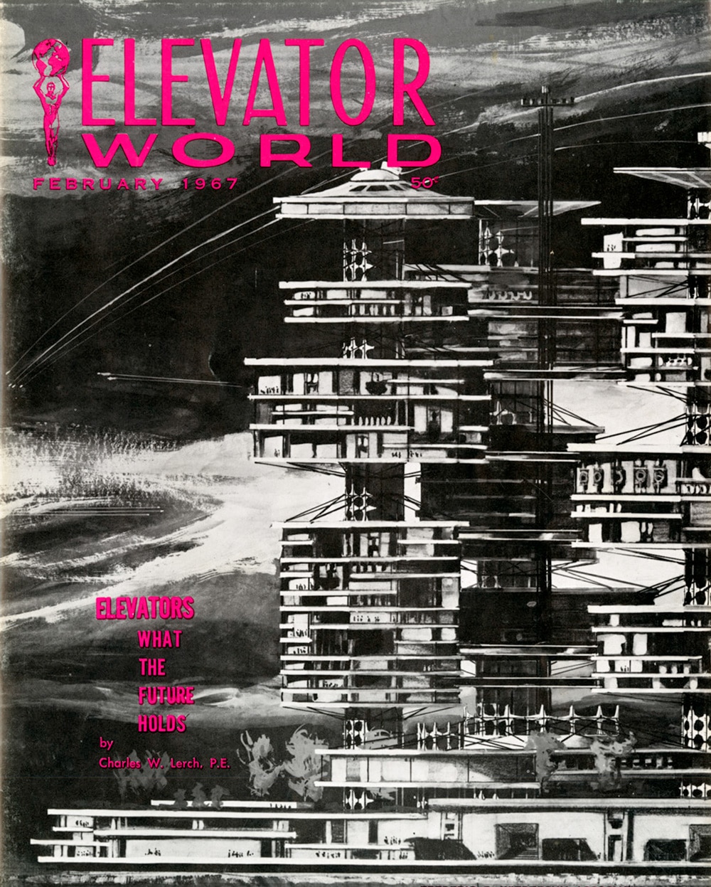 The February and March issues of EW featured a two-part article by Charles W. Lerch, founder of Lerch Bates Inc. The article, firmly grounded in the present, sought to predict the future and was titled “Elevators, What the Future Holds.” Lerch claimed: “The near future — 20 to 30 years hence — can be predicted with some degree of accuracy by a look at the past and a careful examination of the present.” His article opened with an overview of elevator history that focused on the steady increase in operating speeds — from 600 fpm in the early 20th century to proposed speeds of 1,800 fpm in Chicago’s John Hancock Tower (under construction in 1967). He also outlined the history of dispatching and control systems, from car switches to “full collective, semi-collective, and eventually selective collective” controls. Lerch predicted elevator speeds would continue to increase, stating: “With uniformly pressurized buildings, speeds in excess of 5,000 fpm or more can be successfully met with present-day methods.” These speeds would be needed in future skyscrapers, about which he claimed the following: “With a fair degree of confidence, we may expect buildings to go to 150 stories in the next 20 years and probably to 5,000 stories (such as Frank Lloyd Wright envisioned a decade ago) in the distant future” (Figure 5).