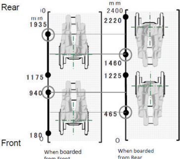 As there are entrances at both ends, we then tested the range when the elevator is boarded from “Rear.” When boarded from “Rear,” the range in which operation is possible is 1,460-2,220 mm for the person near “Rear” and 465-1,225 mm for the person near “Front” (Figure 10). This is the inverse of when boarded from “Front.” The combined range in which operation is possible when boarded from “Front” or “Rear” is 465-940 mm for the wheelchair near “Front” and 1,460-1,935 mm for the wheelchair near “Rear.”