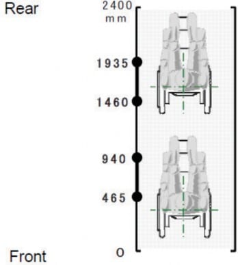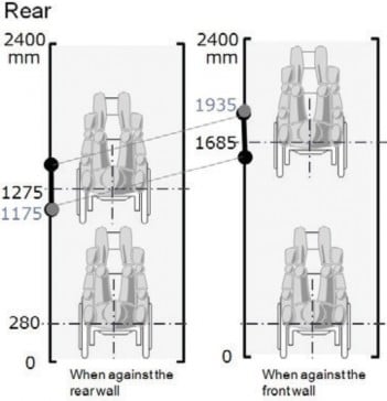 Initially, as shown in Figure 8, when two wheelchair users are in the car, and the wheelchair near “Front” is against the rear wall, the movement range of the center of the wheelchair’s wheel near “Front” is 280-690 mm when the front wall of the car is 0 mm. When combined with the range found in 3.3.2, the range in which buttons can be operated is 180-940 mm. Next, as shown in Figure 9, the movement range of the wheelchair near “Rear” is 1,275-1,685 mm, and the range in which buttons can be operated is 1,175-1,935 mm. The ranges in which operation is possible for two wheelchair users are 180-940 mm and 1,175-1,935 mm. As these do not overlap, operation panels are needed in at least two places so two wheelchair users can use the elevator simultaneously.