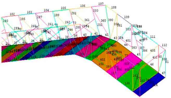 After truss modeling, beam and shell elements are assigned in ABAQUS/6.10. Beam elements are considered angle steel, and shell elements are considered as soffit plates. Soffit plate thickness is assumed to be 3 mm. Nodes and elements are shown in Figure 3.