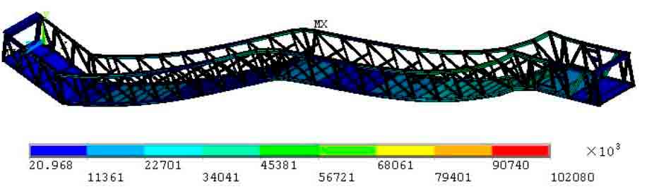 Tension analysis and results are divided to the areas of the soffit plates and angle steel. The tension contour maximum tension occurred in the angle steel, which is 102.08 MPa.