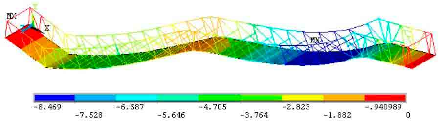 After meshing and analysis in accordance with the displacement contour, the maximum deflection is 8.47 mm.