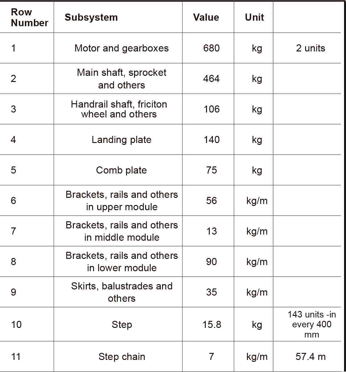In accordance with EN 115, the truss must be compliant with the deflection formula. The truss bears two types of load. The first is the load exerted by subsystems, such as the motor and handrail. The second is the distributed load exerted by passengers. Subsystems’ loads are as listed in Table 2 (both concentrated and distributed loads).